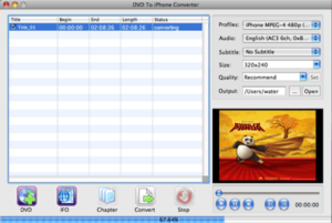 About TOP DVD To iPhone Converter for macTop DVD To iPhone Converter for mac is a powerful and easy-to-use converter software, and it helps you fast convert DVD movie into iPhone video or audio format. The conversion speed is very fast, with amazing sound and image quality. Clips, Auto-shutdown all those personal funcion that you can find on this software .With TOP DVD to iPhone Converter's cute and easy-to-use interface, you will have a good mood when you are at work or entertainment.More Description from Publisher: