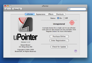 About uPointer For MacuPointer For mac allows the user to increase the visibility of the mouse pointer/cursor by overlaying a mark to the area around the cursor. This mark can either be a circle, ring, cross, line, or crosshair, and has user-definable transparency, size, and color. UltraPointer eliminates the need to bring a laser-pointer along to presentations, and can help users with impaired vision. uPointer is perfect for users with eye-sight problems.More Description from Publisher: